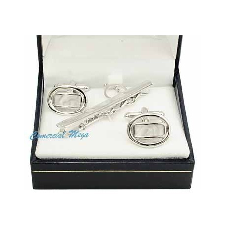 Juego de gemelos y pisacorbatas en metal rodiado, ovalados con nácar