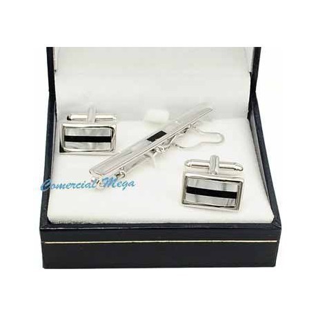 Juego de gemelos y pisacorbatas metal rodiado con nácar y banada en negro rectangulares