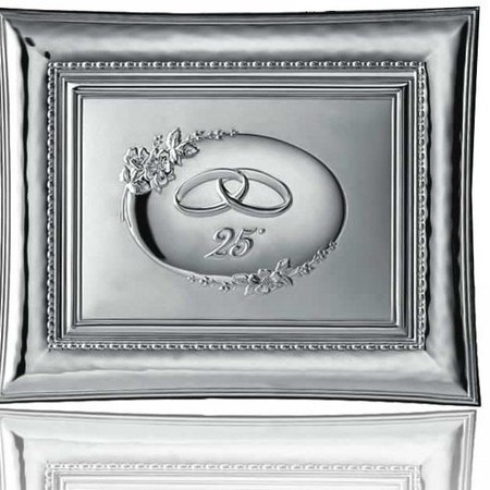 Placa en plata bilaminada con alianzas y 25 aniversario, parte central extraíble para utilizar como marco para foto. Medida total 18,5x24,5cms